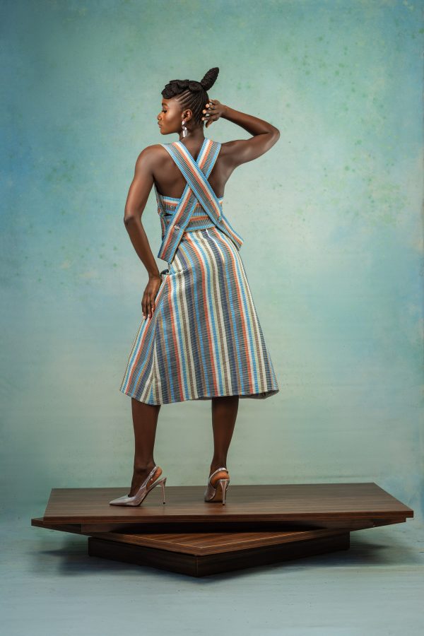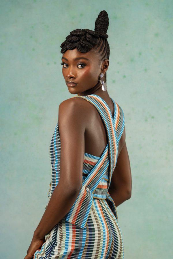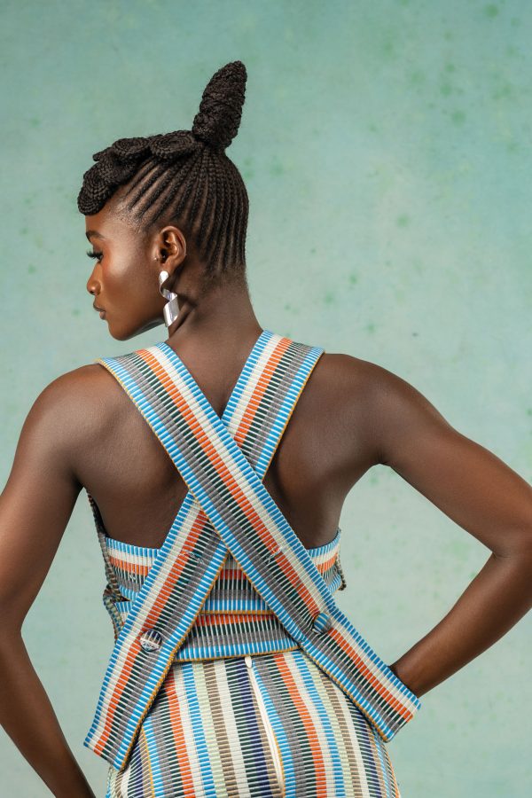 Made with aso-oke fabric, this piece features a waist coat with a long strap attached to the piece to style as desired.