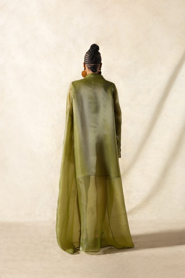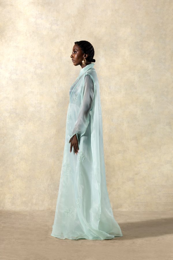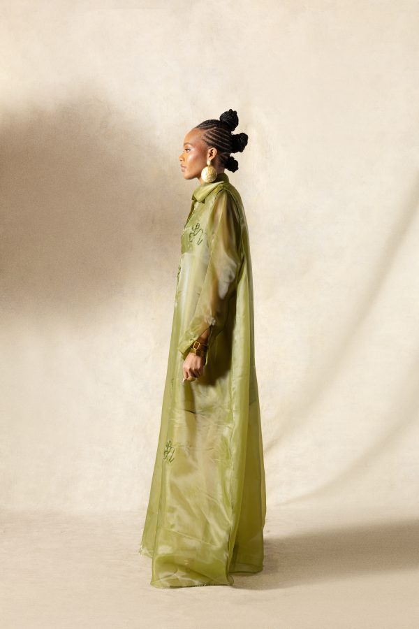 Made with fine organza fabric. This design consists of a flowing shirt dress with a oversized fit. The dress is adorned with subtle embroidered patterns representing the FIA logo throughout, adding texture and sophistication.