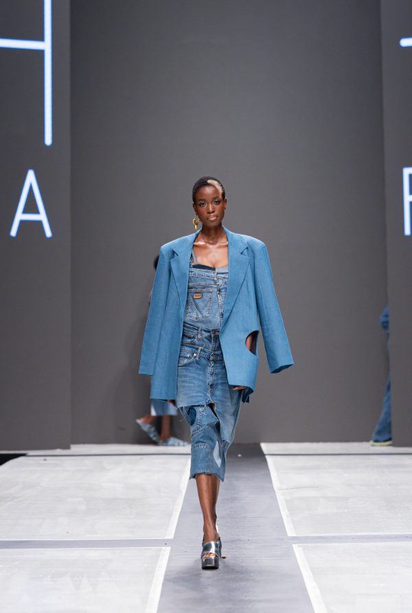 Made with denim fabric, this piece features an oversized long-sleeved jacket with a cut-out on the left side of the jacket