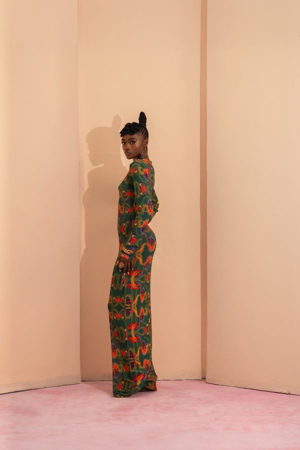 Made with delicate custom FIA Print mesh fabric, this piece features a striking full-length bodycon dress with high, round neckline and long, fitted sleeves extending to the wrists.