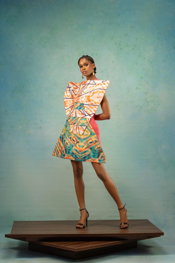 Made with cotton fabric, this piece features a sleeveless mini dress with triangle-shaped flaps interlocked together and attached to the mini dress