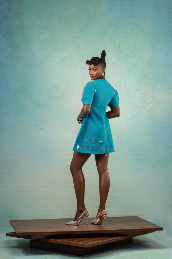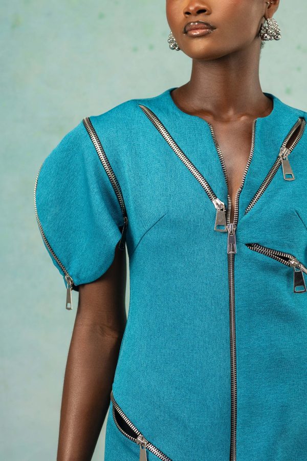 This piece showcases a striking and contemporary mini dress. The dress is structured and modern, featuring an asymmetrical design accentuated with metallic zipper details adding an edgy vibe and puff-style sleeves which brings an element of drama and femininity.
