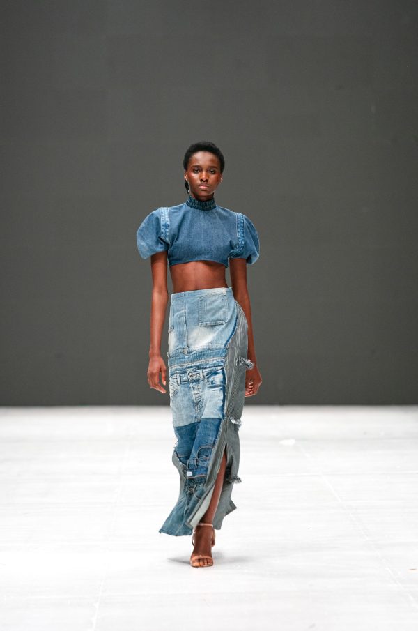 Made with upcycled denim, this piece features a crop top with a turtle neck and puffed sleeves.