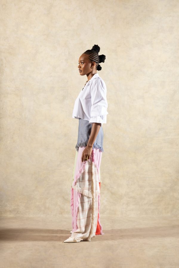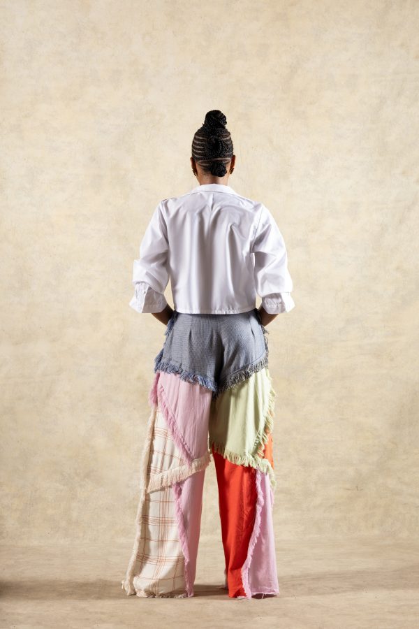 Made with a mix of vibrant linen fabrics, this piece features a high waist pants made from patches of fabrics with shredded edges.