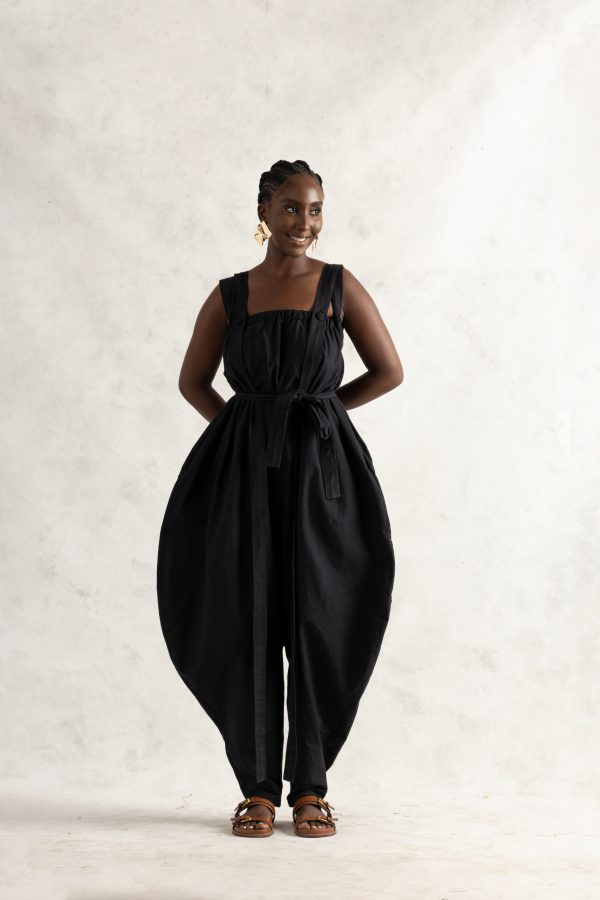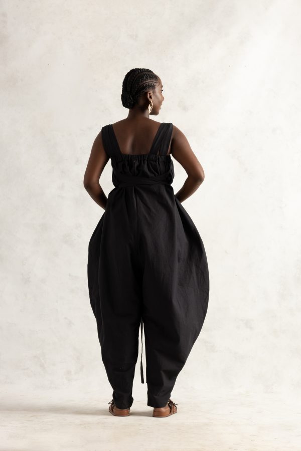 Made with linen, this tube jumpsuit comes in a loose fitting and a fitted bottom, cut in a cocoon shape with long straps attached to it and buttons to secure in place