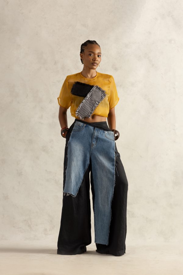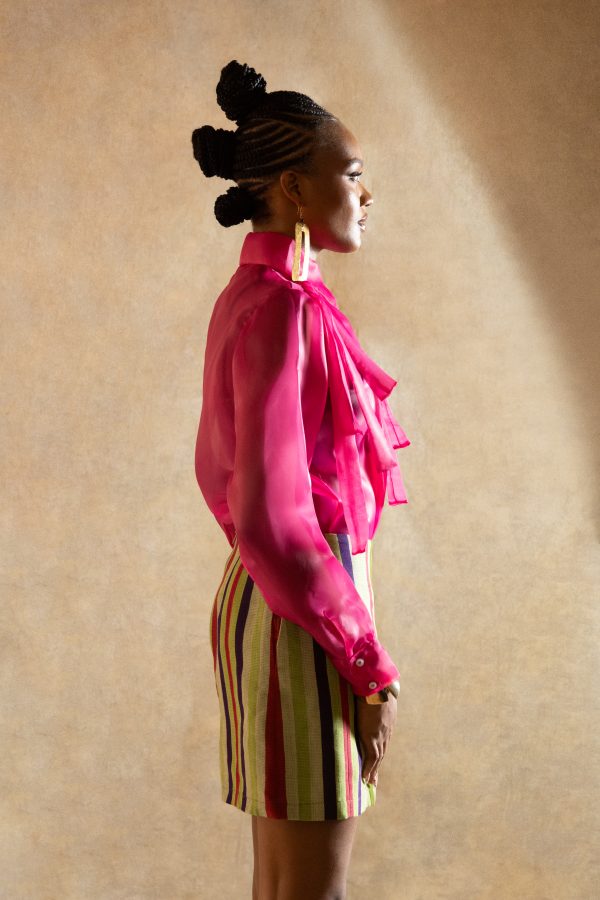 Made with organza fabric, this piece features a collared, long-sleeved shirt with straps on the shoulder of the shirt