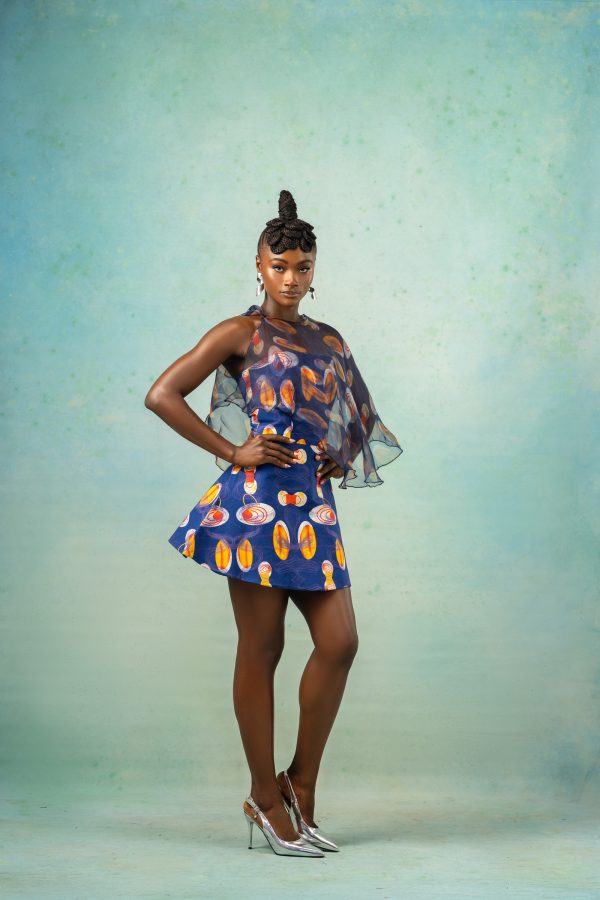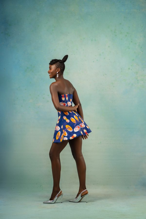 This design features a chic and modern mini dress made from a custom FIA print cotton fabric. The dress is tailored to accentuate the waistline, flaring slightly into a playful A-line silhouette.