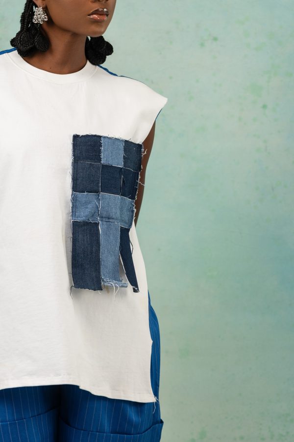 This piece features a playsuit, it has a white sleeveless, loose-fitted shirt with a denim patchwork pocket on the left chest area attached to the playsuit.