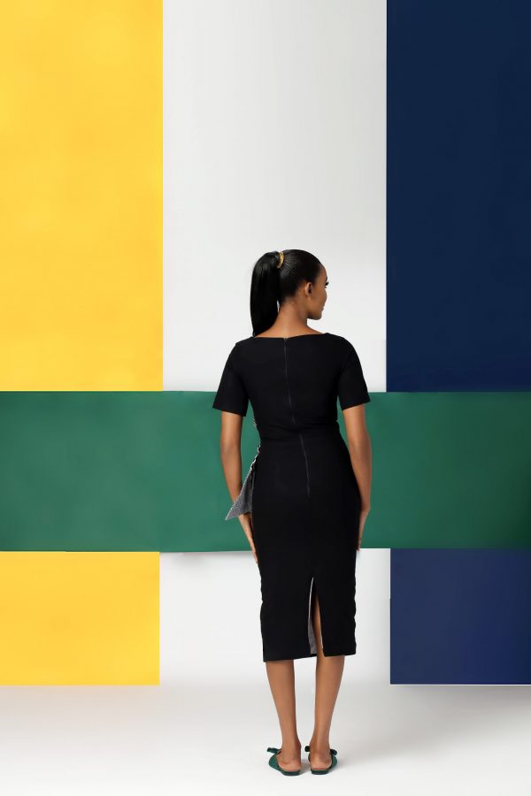 A simple black fitted work dress with a Triangle-shaped flap attached on it. Made with crepe.