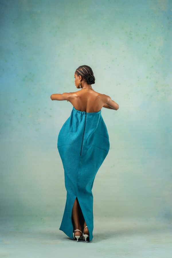 This piece features a contemporary strapless maxi dress which adopts a cocoon-like silhouette with a slight fold at the top designed like a shirt collar. It features a centre-front button placket which runs the length of the dress and a zipper at the back of the dress.