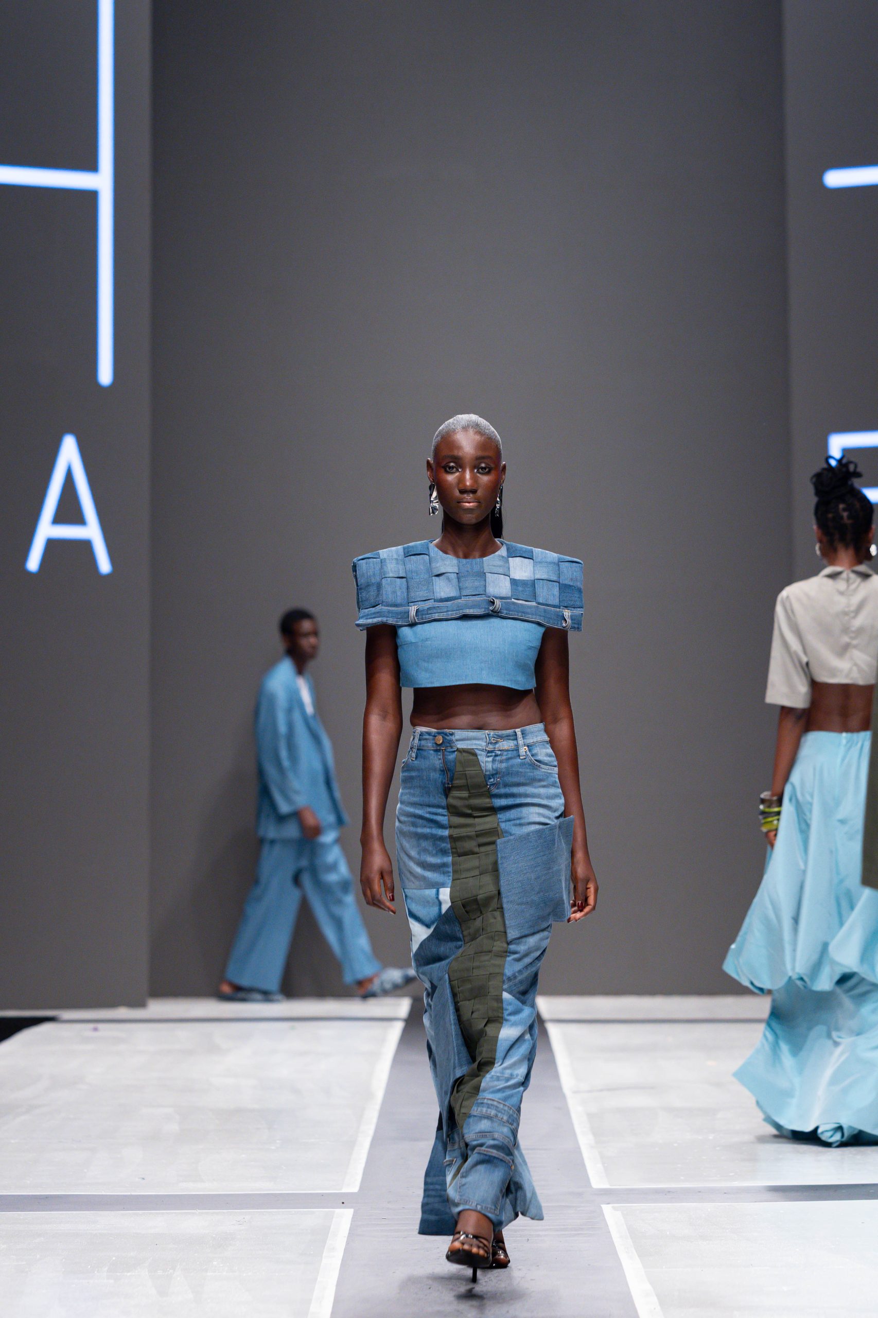 Made with upcycled denim. This piece features a long straight skirt with a woven panel detail in from and a zipper and slit at the back