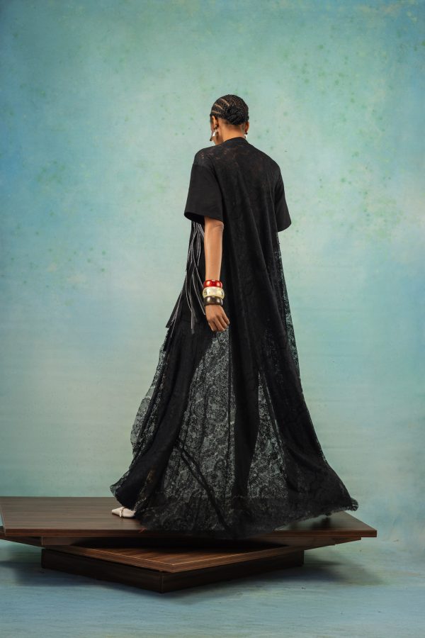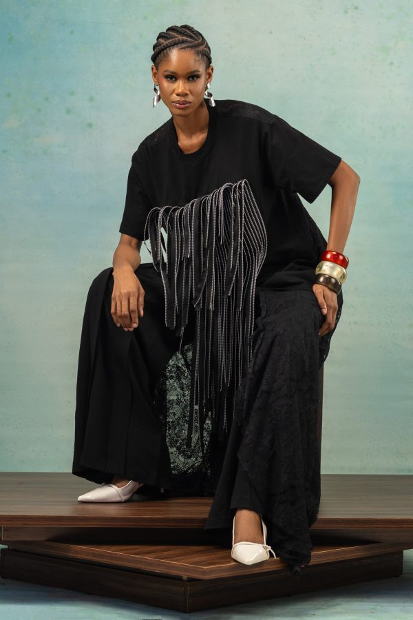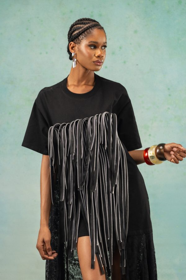 This piece features a combination of a loose-fitted t-shirt with a lace fabric used for the back of the dress. It also features a patchwork of zipper detailing on the dress. It can be worn as a dress or styled with pants.